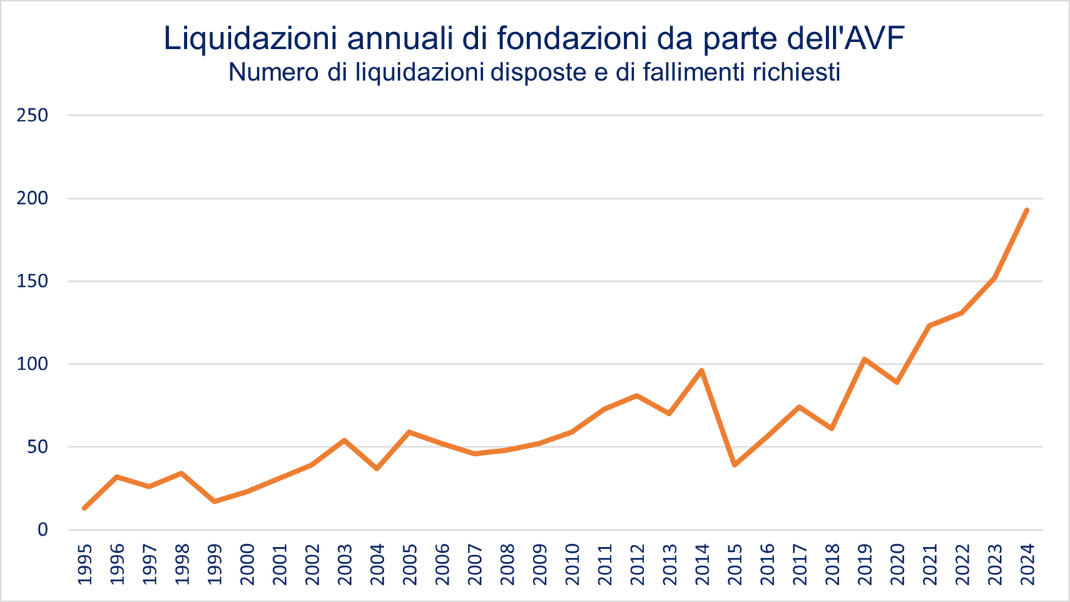 Nel 2024, l'AVF ha formalmente deciso lo scioglimento o richiesto il fallimento di 193 fondazioni. Il numero di scioglimenti è quindi aumentato di nuovo in modo significativo, del 27%, da 152 a 193.