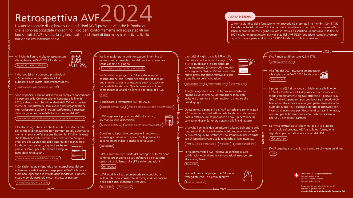 Questa retrospettiva dell'Autorità federale di vigilanza sulle fondazioni AVF per il 2024 contiene informazioni chiave sulle attività di vigilanza e sugli sviluppi nel settore delle fondazioni.